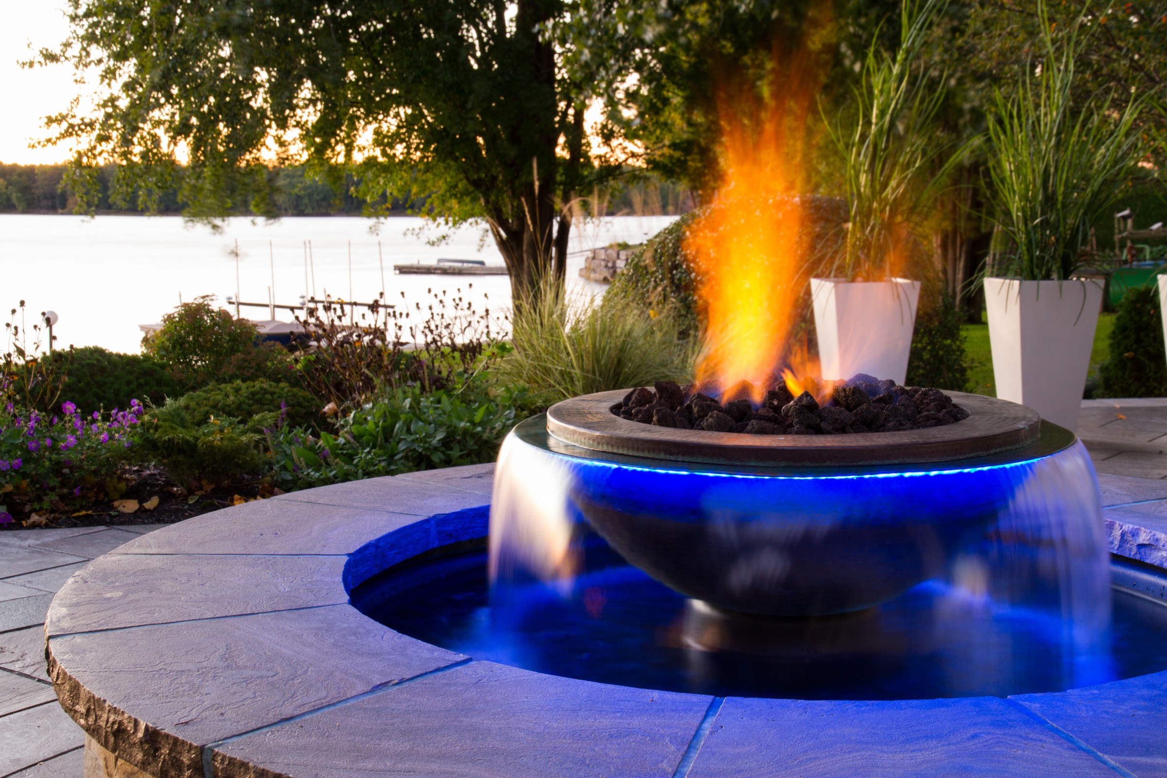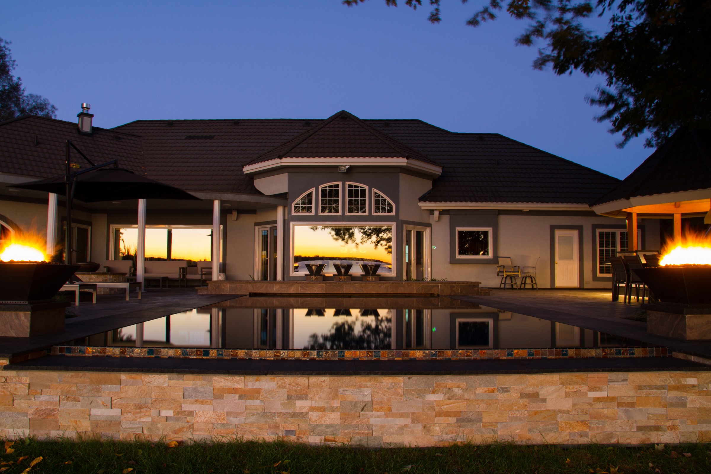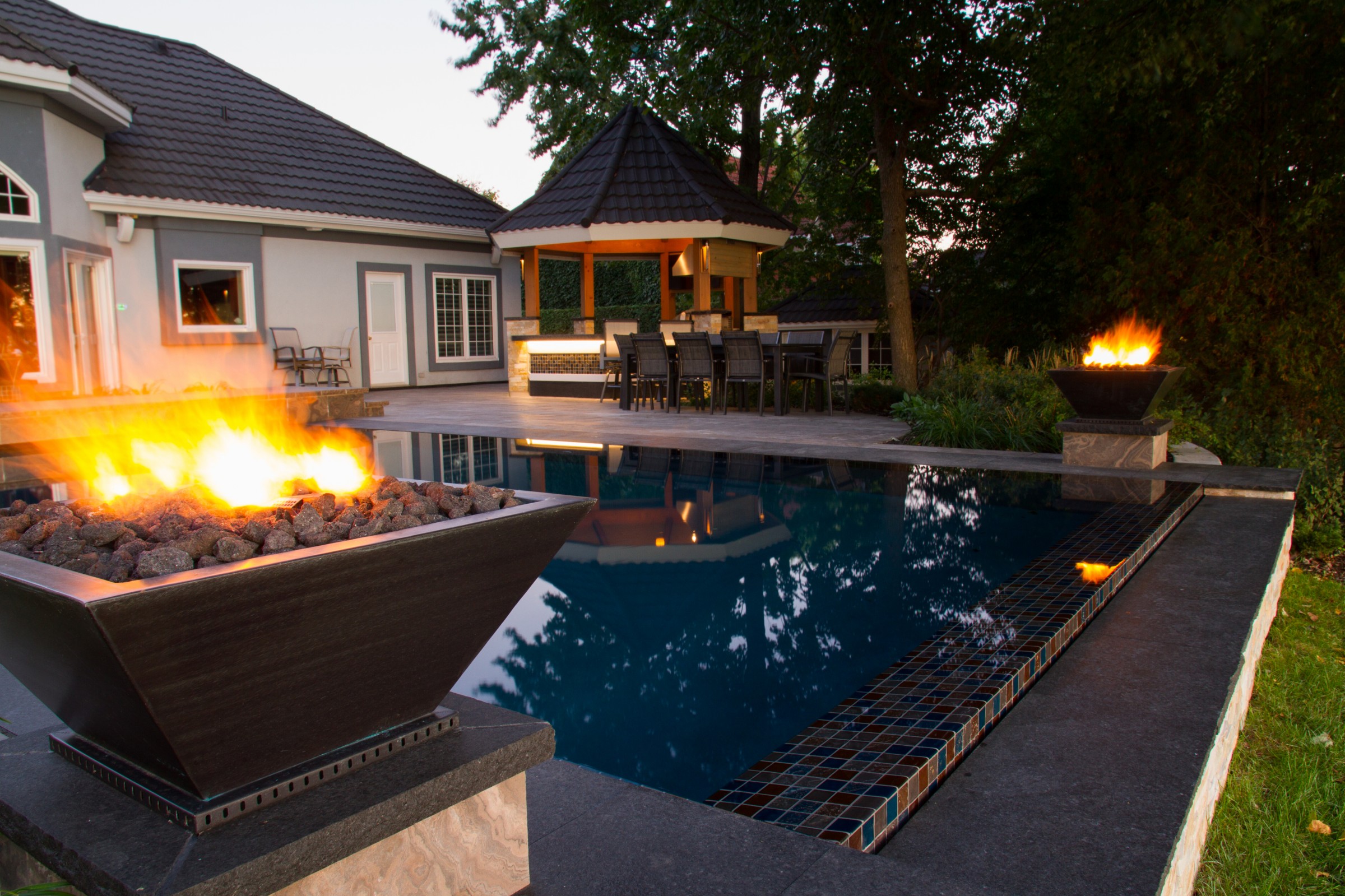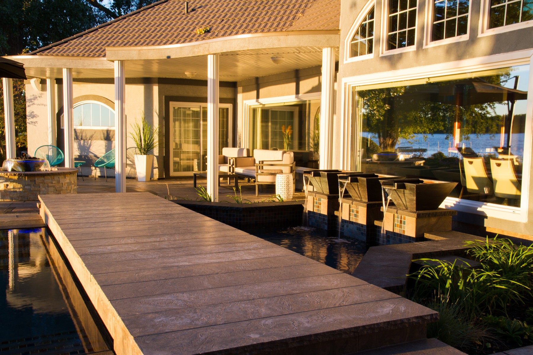 The client’s view of the river was heightened by incorporating a vanishing edge along with the perimeter-overflow design. However, before this could be accomplished, the pool and patio elevation had to be raised. This involved regrading to ensure the transition between the pool and river was seamless when viewed from inside the home. Finally, an extravagant covered entertainment area, complete with outdoor kitchen, was also built.