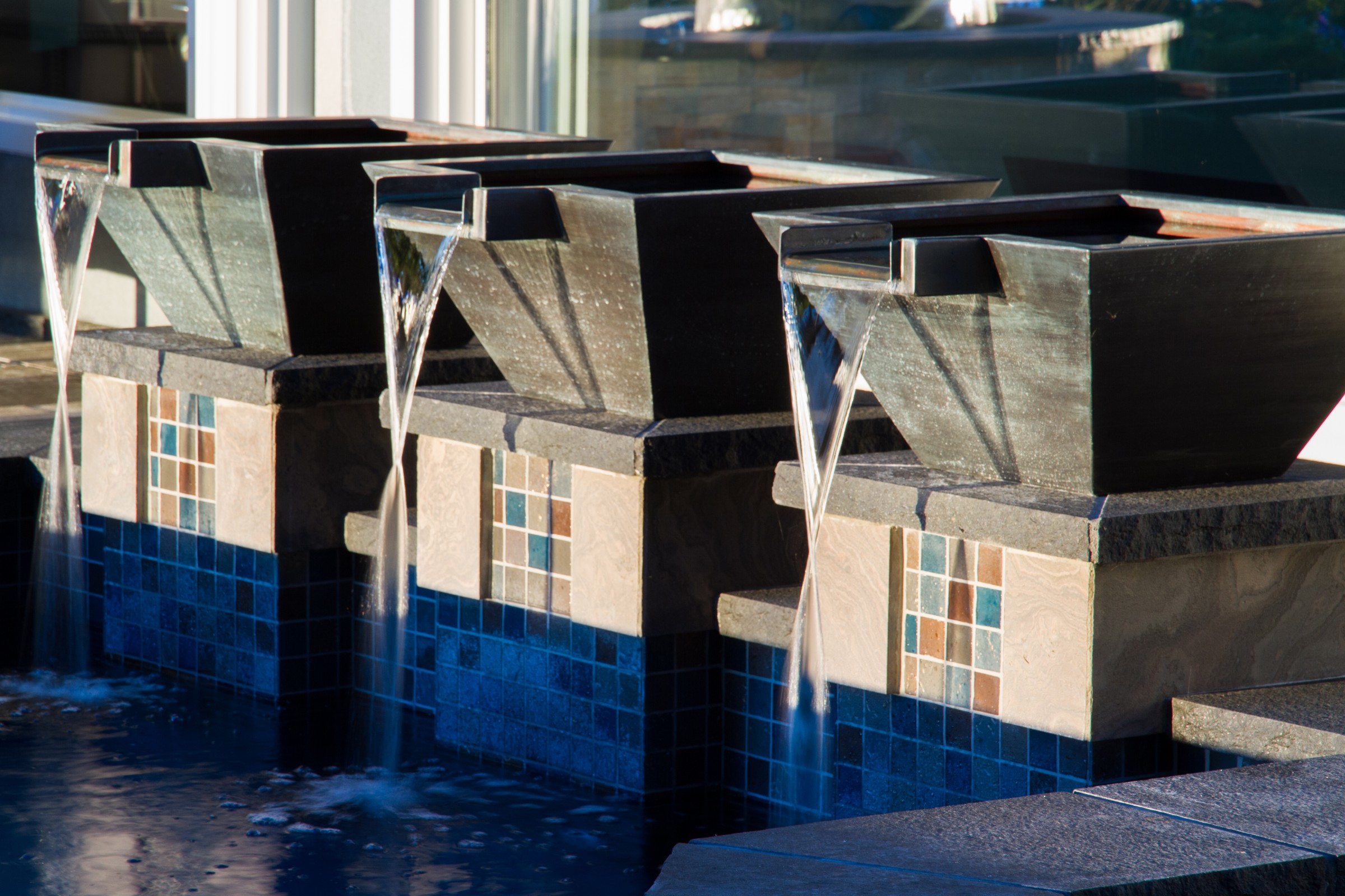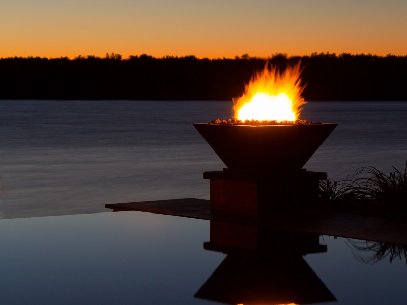 The knife-edge consists of a pool wall that slopes away from the water’s edge at a sharp angle, making the pool appear to have no true or visible coping or wall. When the water is still, its reflective qualities and mirror-like surface create a breathtaking appearance.