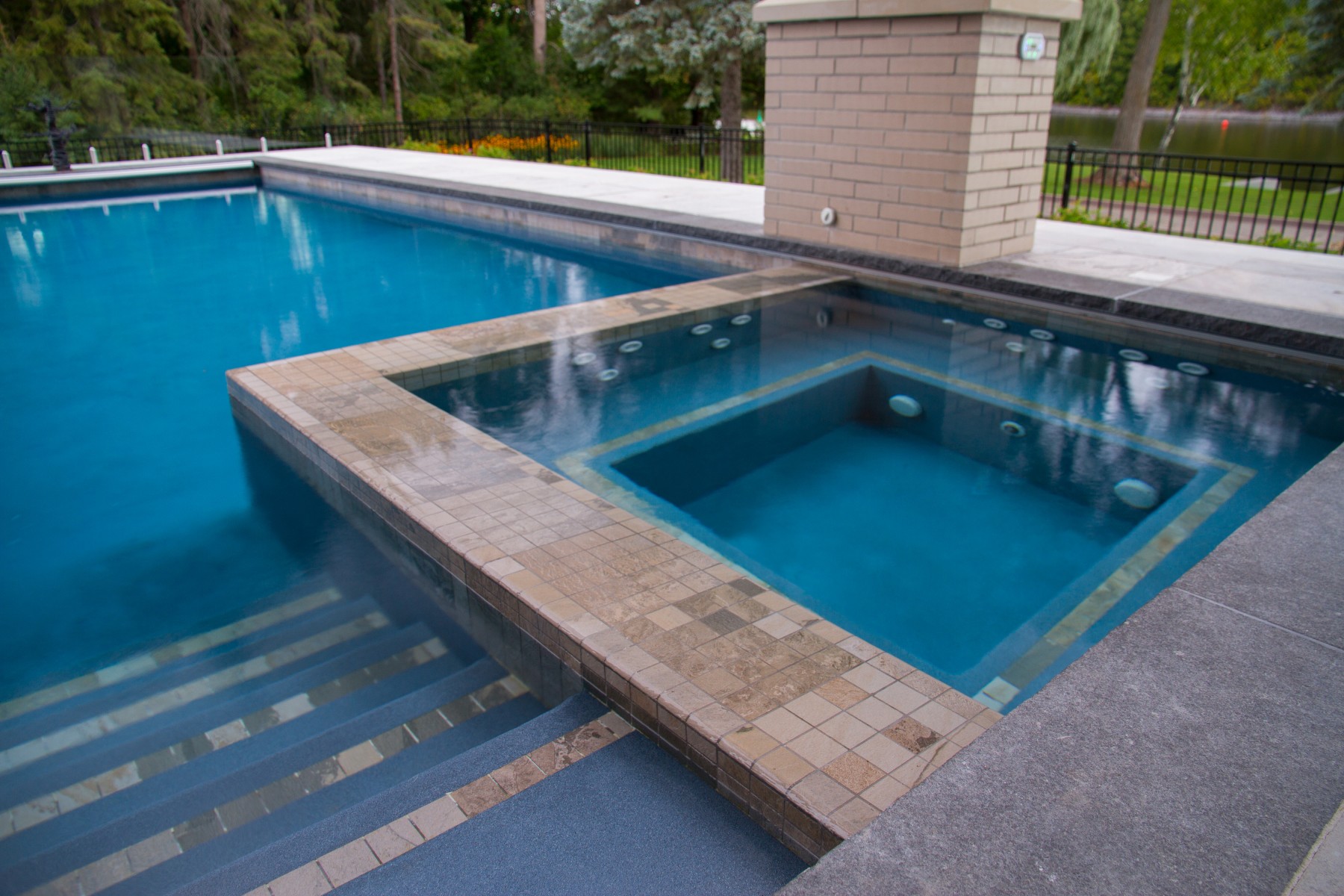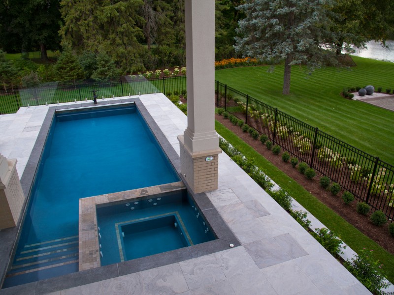 Since these features were an integral part of the home’s design, installation of the pool, spa, and landscaping took place in tandem with the house’s construction. Careful planning and coordination of all sub-trades were crucial to the project’s success. The 3.8 x 10.4m (12.5 x 34ft) cast-in-place concrete pool features a 2.4 x 2.4m (8 x 8ft) concrete spa located at one end.